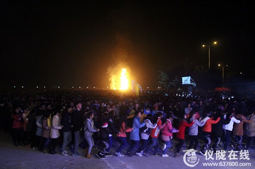 晚9时,在全场的满怀期待中,学生会主席刘虎城同学接过何玲珑副校长手中的火把点燃了篝火。熊熊的火苗瞬间燃烧,点燃了所有人的激情。现场掌声雷动,欢呼声震耳欲聋。在熊熊燃烧的篝火映衬下,师生手拉着手,围着篝火载歌载舞,共庆新年的来临。