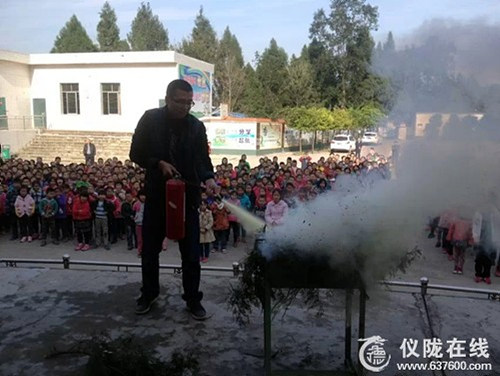 警报声响起,在各层楼安全管理员的指挥下,全体学生按预定路线,快速、有序地用衣服捂住口鼻、弯下身体,快步下楼撤离到集合场地。随后,大队辅导员林科建老师亲自上阵为全体师生示范灭火器的使用方法。部分学生也上台体验,真正切身领会灭火器使用方法。