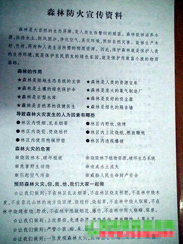 学校利用集会、主题班队会、黑板报等多种形式向学生宣传森林防火知识、森林防火法律法规、火灾自救及扑救方法,教育学生认识野外用火的危险性,教育学生不携带火种、火具、烟花爆竹和易燃易爆等物品进山游玩。全校发放了《森林防火宣传资料》,要求学生和家长共同学习,家校配合共同做好森林防火教育工作,力争达到“教育一个学生,带动一个家庭,影响整个社会”的效果。