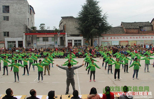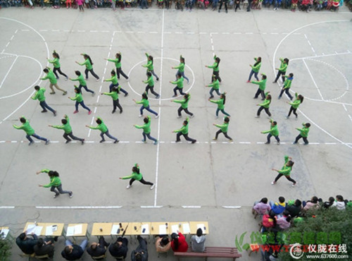 此次活动由学校教导处牵头,以各班级为单位进行。在隆重的升国旗,唱国歌仪式之后,紧张激烈的比赛开始了。整队集合、前后左右转、原地踏步、行进间走与跑等队列队形的变化,在班级领操员的口令下有条不紊的进行,系列武术健身操“旭日东升”更显气势,参赛班级口号有力,动作整齐,收放到位。比赛结束后,学校副校长吴开翼同志对学校体育工作提出更高要求并给予良好祝愿。