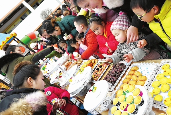 新鲜的水果拼盘、甜香扑鼻的糕点、热气腾腾的烤串……1月3日,仪陇县渔田幼儿园操场上,家长和孩子们把一个个美食“摊点”围得水泄不通(如上图)。