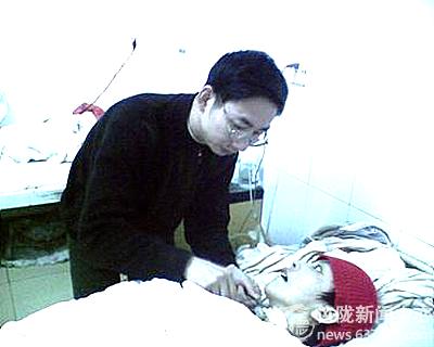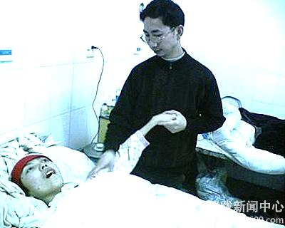 图为 陈伟忍住悲伤安慰早已没了知觉的爱妻