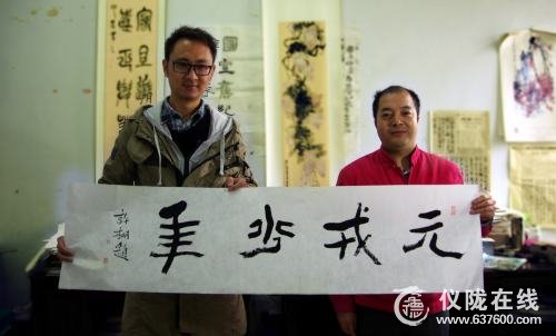许棚(右)老师题字和《元戎少年》的主创人员景瑞均(左)合影