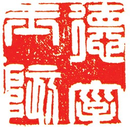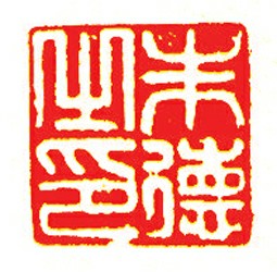 白文,名号印。此印以小篆 入印,有明代印风,典雅、矜持。印面大虚大实,强烈的朱白空间对比。四字长扁,结体对比夸张,变化鲜明。线条笔画或尖、或方、或圆,变化微妙。总体笔画均 匀,线条酣畅,宽厚圆润,刀痕清晰,生动自然。印面浑然一体,边缘残破,将印面内外空间紧密相连,在有限的方寸之间沟通了广阔的外部世界。